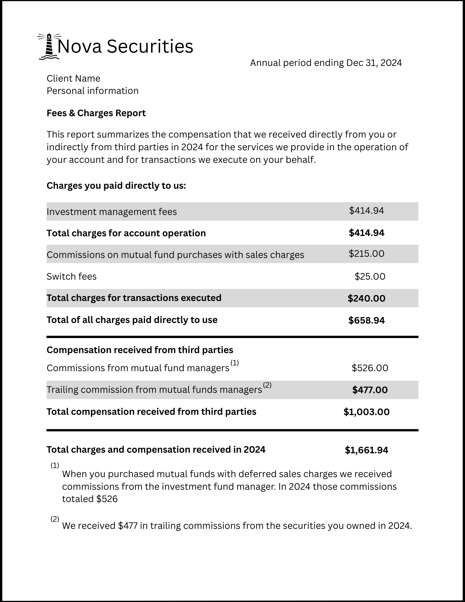 Underneath the directly paid fees is compensation from third parties. Depending on the type of securities you own this section could be lengthy, or it may not have any data at all. In the example, these are charges from mutual fund commissions. This incudes costs from deferred sales charges (DSCs), and trailing commissions. You may be aware that under securities laws DSCs are no longer allowed. However, any funds that were purchased prior to the ban on DSCs may still be in client’s accounts and because of this DSCs may still appear on your statements.