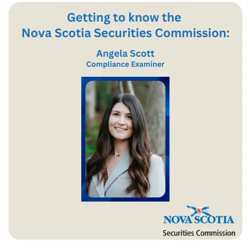 How much do you know about the Nova Scotia Securities Commission (NSSC) and the people behind it? The Before You Invest Blog has previously published posts on the Commission, highlighting our mandate and the role of the different Commission branches. But, what about the people that make up the Commission, the ones who shoulder that mandate and tirelessly work to protect Nova Scotia investors? Our new series “Getting to know the Nova Scotia Securities Commission” takes a closer look at some of these people, what they do and how they support the mandate of the NSSC. Today we’re speaking with Compliance Examiner for the NSSC, Angela Scott.