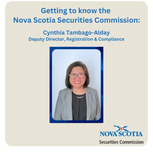 I’m Cynthia Tambago-Alday, the Deputy Director of Registration & Compliance. I oversee the registration of firms and individuals seeking to trade or advise in securities or manage investment funds in Nova Scotia and I also oversee compliance reviews to ensure they continue to meet regulatory standards.